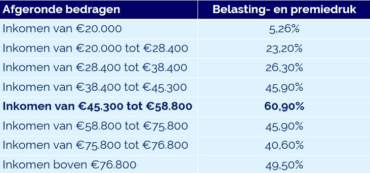Het eerste deel van het inkomen van een pensioengerechtigde wordt vanaf de AOW-leeftijd relatief laag belast. Tot een bruto inkomen van ca. €20.000,- zijn de heffingskortingen nog voldoende om belastingheffing in de eerste schijf te compenseren en betaalt de AOW-gerechtigde alleen de inkomensafhankelijke zorgpremie van 5,26%. Daarna is de belasting en premiedruk tot €38,441,- nog beperkt tot zo’n 26,30%. Vervolgens via een stijging van 45,9% tot €45.300,- loopt de belastingdruk en premiedruk daarna sterk op tot 60,9%. Van elke €1000,- die de AOW-er boven € 45.300,- ontvangt, houdt hij ineens slechts netto € 390,- over.