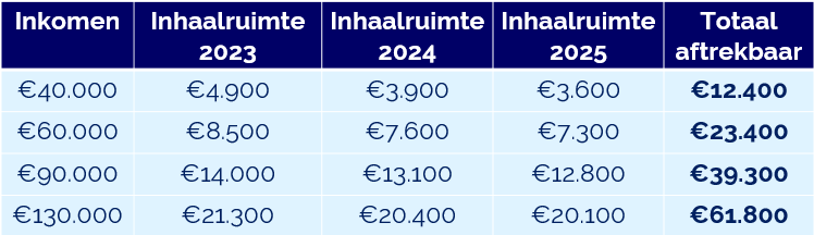 Onderstaand overzicht geeft een indruk van de jaar- en inhaalruimte bij verschillende inkomens en een optimale pensioenregeling (bijvoorbeeld ABP). In veel gevallen is de pensioenregeling minder goed, waardoor de jaar- en inhaalruimte substantieel hoger zullen zijn.